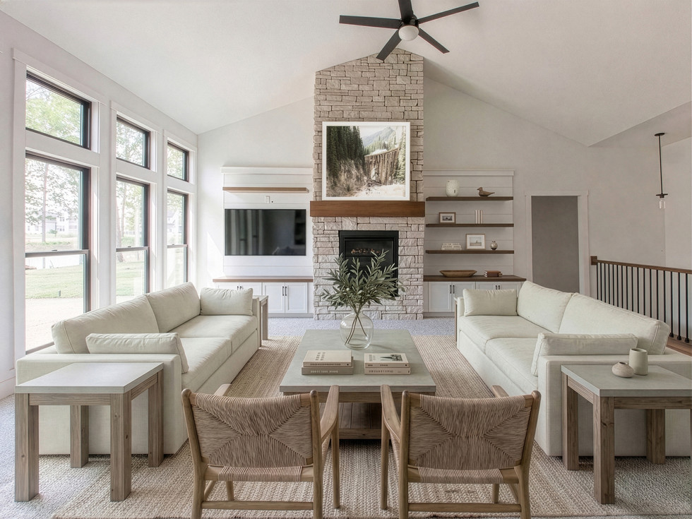 INTERIOR: Inside, beautiful ceiling trusses in the great room & kitchen show how truly custom this interior is. A breathtaking kitchen awaits with gleaming quartz countertops, a custom stained wood hood, a beautiful tiled backsplash, and a frosted glass door leading to a walk-in pantry. a massive floor-to-ceiling stone fireplace in the great room (with built-ins on both sides) and a cozy stone and shiplap fireplace in the sunroom. Extra-wide plank floors flow seamlessly through the main living space, perfectly complemented by charming farmhouse trim, custom built-ins, and a stunning stained wood staircase with black iron balusters. This is truly an amazing value for such a custom designed & built home.